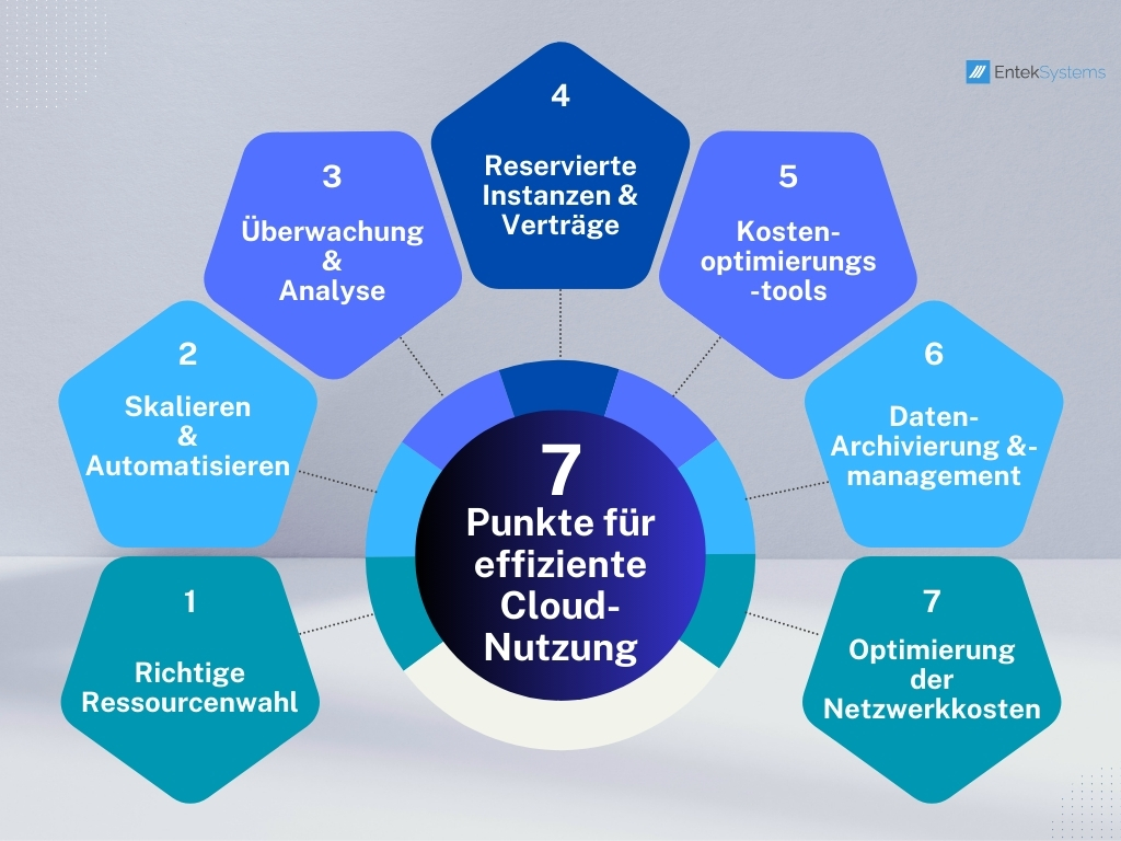Überprüfen Sie regelmäßig Ihre Cloud-Nutzung. Richten Sie Ressourcen so ein, dass sie entsprechend Ihren Anforderungen skalieren. Prüfen Sie auch, ob ungenutzte Ressourcen abgeschaltet oder in kleinere Instanzen verschoben werden können, um Kosten zu senken.