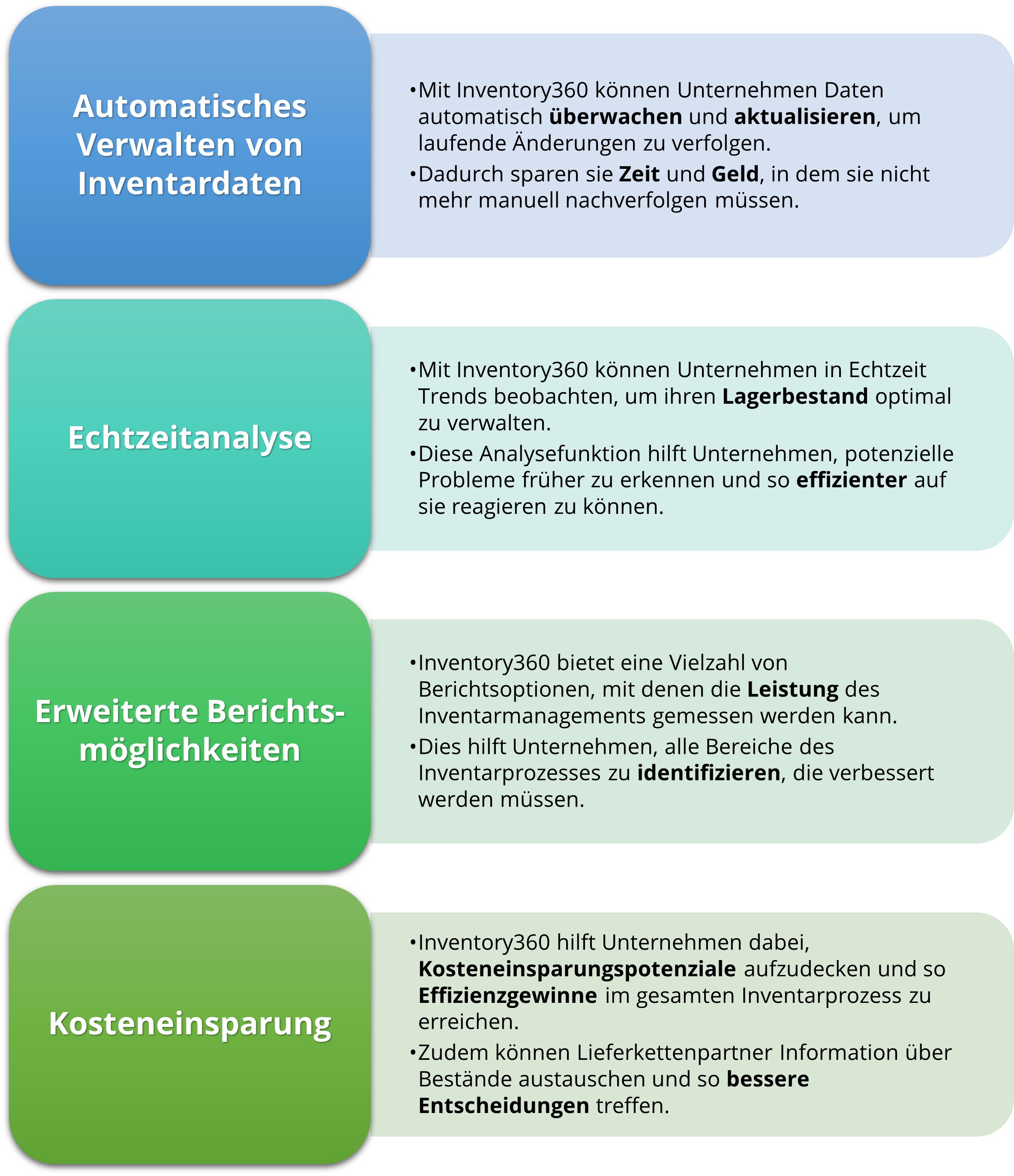 Inventory360 bietet viele verschiedene Funktionen, mit denen Unternehmen Ihr Inventory vereinfachen und Ihre Inventardaten effektiv und kosteneffizient verwalten zu können.