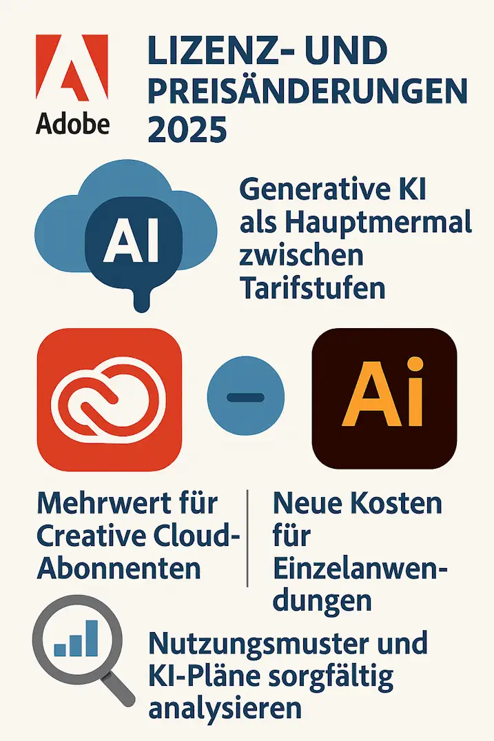 Die Lizenz- und Preisänderungen von Adobe im Jahr 2025 stellen eine bedeutende Weiterentwicklung des Ansatzes des Unternehmens zur Lizenzierung kreativer Software dar. Generative KI-Funktionen dienen dabei als Hauptunterscheidungsmerkmal zwischen den Tarifstufen.