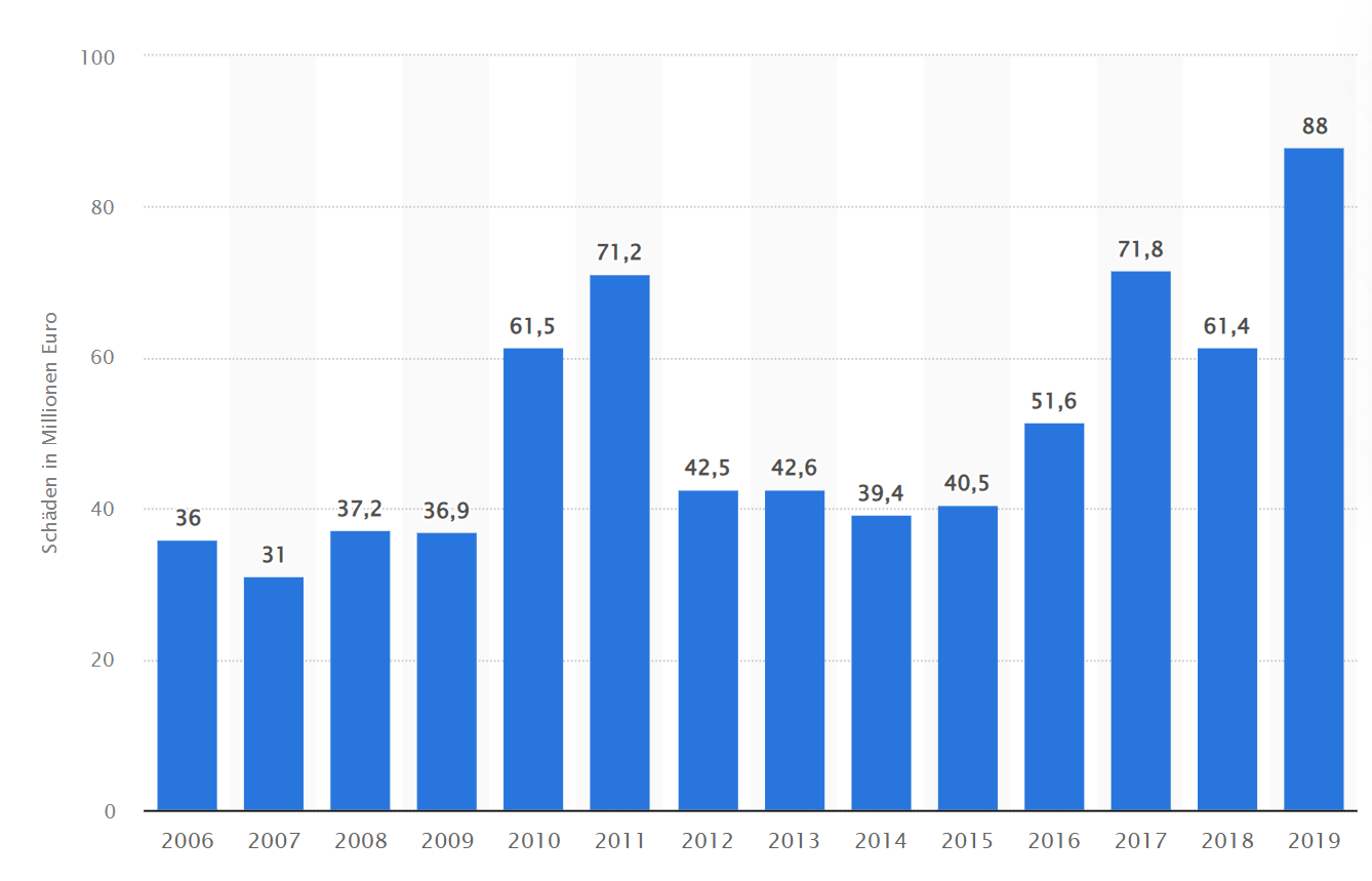 Die Statistik zeigt die Schäden durch Cyberkriminalität (Schäden in Fällen des Computerbetrugs und der missbräuchlichen Nutzung von Telekommunikationsdiensten) in Deutschland in den Jahren von 2006 bis 2019 in Millionen Euro. Im Jahr 2019 verursachte Cyberkriminalität in den Bereichen Computerbetrug und der missbräuchlichen Nutzung von Telekommunikationsdiensten in Deutschland Kosten in Höhe von ungefähr 88 Millionen Euro.