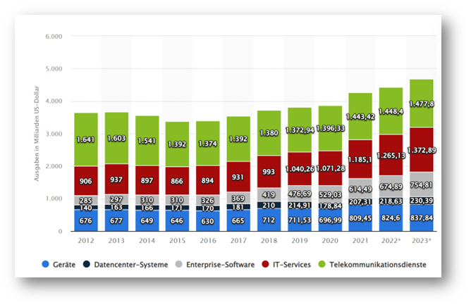 Die Statistik bildet die weltweiten IT-Ausgaben nach Bereichen bis 2021 ab und gibt eine Prognose bis 2023. Laut Quelle sollen sich die weltweiten Ausgaben für IT-Services im Jahr 2023 auf rund 1,37 Billionen US-Dollar belaufen. Führend sind hier insbesondere Telekommunikationsdienste und IT-Services, doch gerade auch Enterprise-Software hat in den letzten Jahren stark an Bedeutung zugenommen. Der Bereich "Geräte" bezieht sich laut Quelle auf PCs, Tablets, Mobiltelefone und Drucker.