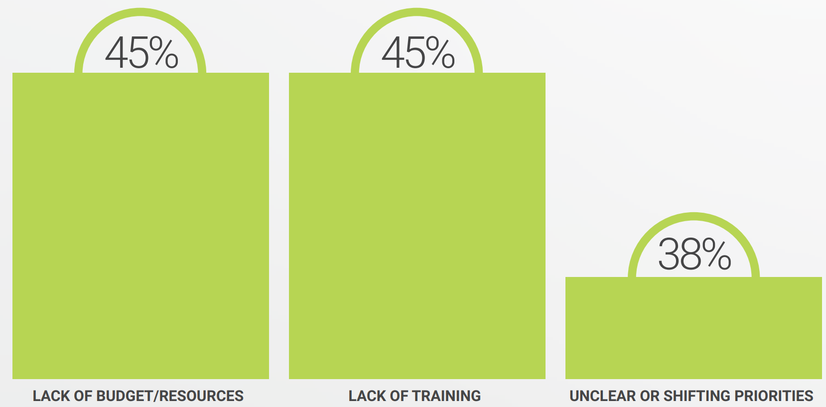Daher sind die drei am häufigsten genannten Probleme bei der Minderung und/oder Bewältigung von Unternehmensrisiken Mangel an Budget bzw. Ressourcen (45%), Mangel an Mitarbeiterschulung (45%) und unklare Prioritäten (38%). Keines dieser Probleme ist überraschend und alles wird Ihnen sicherlich bekannt vorkommen. Denn seit über einem Jahrzehnt stehen diese Herausforderungen ganz oben auf der Liste der IT-Experten. Immer wieder hört man gebetsmühlenartige Verharmlosungen von Unternehmensleitungen a la Mit wenig Aufwand, maximalen Output erzeugen.