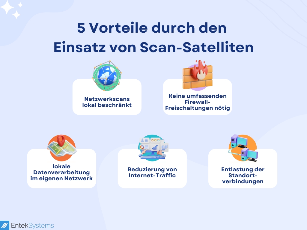 Dies hat den Vorteil, dass die Netzwerkscans lokal beschränkt erfolgen und somit auch in abgelegenen Standorten und Netzwerksegmenten durchgeführt werden können.
