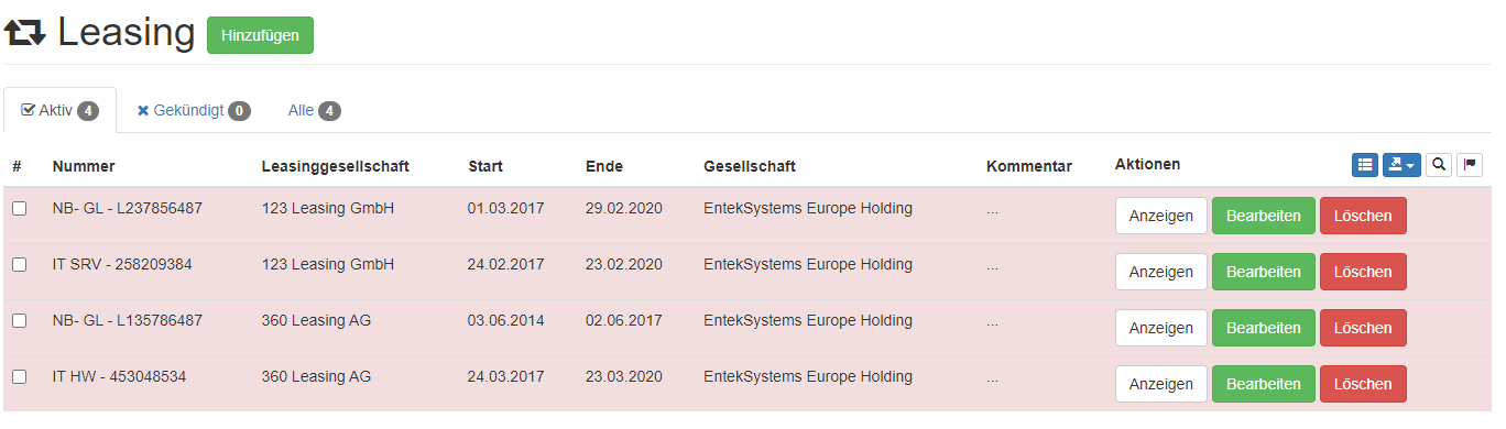 Zwecks besserer Übersicht und Handling wird empfohlen die Assets über den Leasinggeber in Verträgen zu bündeln. Somit wird die Anzahl der Leasingverträge verringert und eine Abrechnung und Übersicht vereinfacht:
