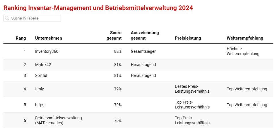 In der Kategorie Inventar-Management und Betriebsmittelverwaltung wurde die beste Softwarelösung des Jahres gekürt – eine entscheidende Unterstützung für Unternehmen, die ihre Ressourcen effizient verwalten und den Überblick über Betriebsmittel und Inventar behalten möchten.