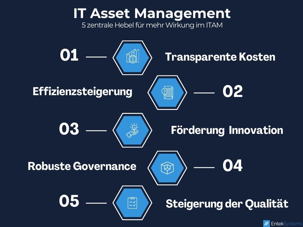 Durch diese strukturierte Herangehensweise schafft ITAM klare Transparenz über vorhandene Ressourcen, deren Nutzung und Zustand. Dies bildet die Grundlage für fundierte Entscheidungen, etwa bei Investitionen oder der Ausmusterung von Altgeräten. Gleichzeitig trägt ITAM wesentlich zur Kostenkontrolle bei, indem es Lizenzüberschreitungen vermeidet, ungenutzte Ressourcen identifiziert und Einsparpotenziale aufdeckt.