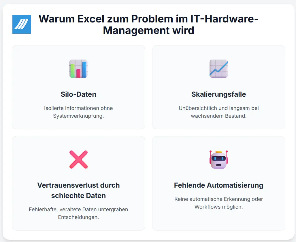 Viele Unternehmen nutzen Excel für IT-Hardware-Verwaltung. Doch die scheinbar einfache Lösung führt oft zu Chaos: fehlende Übersicht, Fehler und Sicherheitsrisiken sind die Folge.