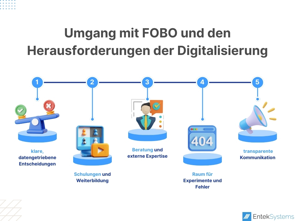 Um FOBO zu bewältigen und die Herausforderungen der Digitalisierung erfolgreich zu meistern, können Unternehmen folgende Schritte und Maßnahmen ergreifen: