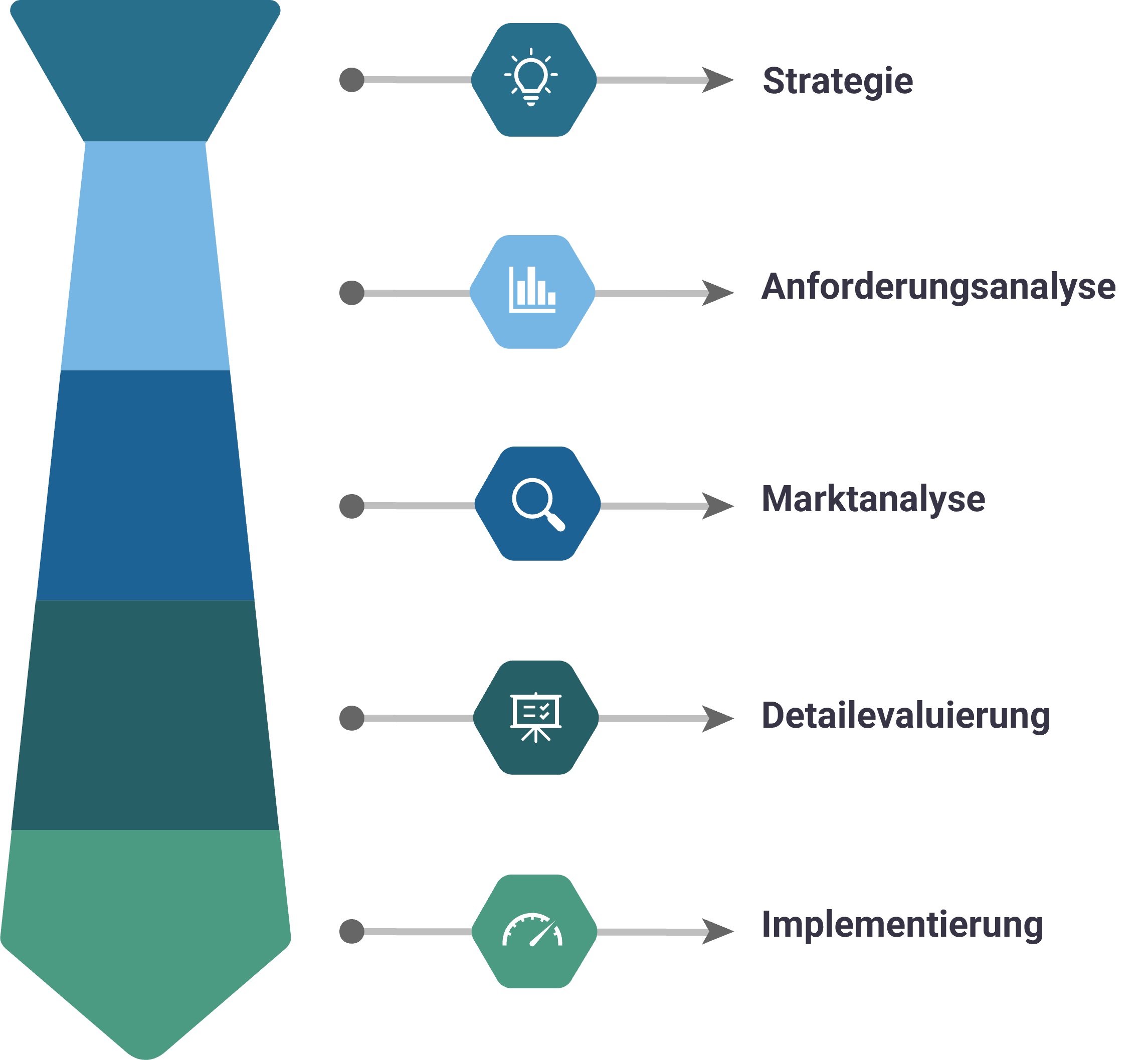Die Basis des Erfolgs einer Software liegt in einer vorher festgelegten und durchdachten Strategie. Sie definiert den Prozess, legt die Weichen für das Datenhandling und trägt entscheidend zur Weiterentwicklung des eigenen Unternehmens bei. Im Anschluss eine entsprechende Strategie folgt eine Anforderungsanalyse, bei der jeder Punkt konkret in den Fokus rückt und man sich mit geeigneten Methoden Schritt für Schritt zum konkreten Bedarf arbeitet.