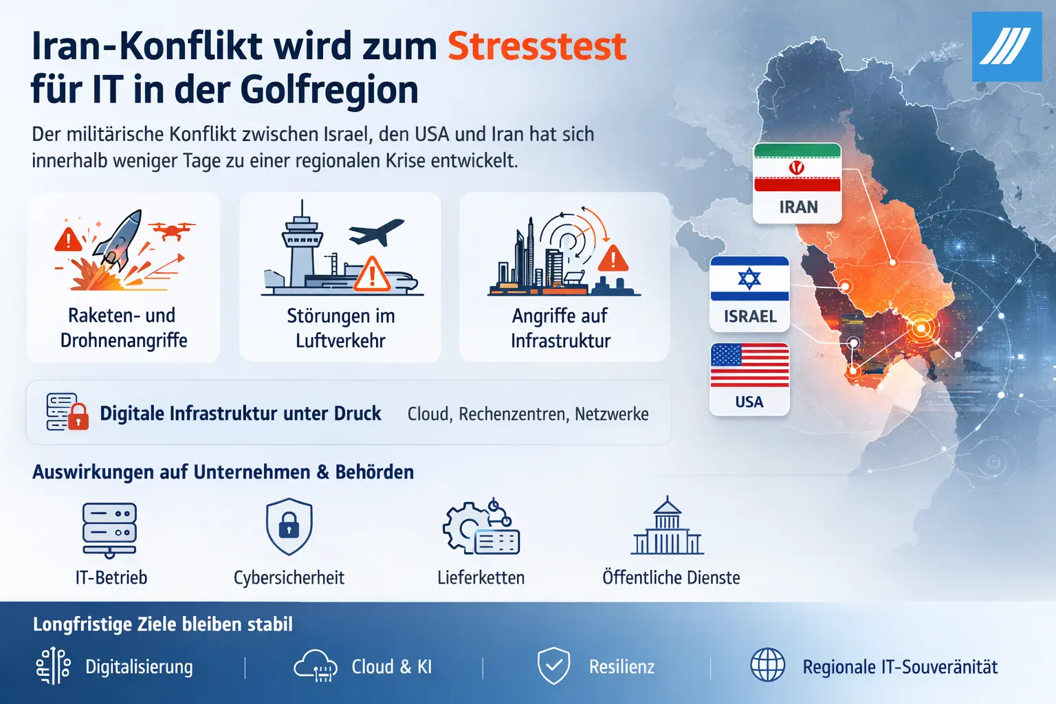 Der Konflikt zwischen Israel, den USA und Iran könnte daher langfristig sogar zu einem stärkeren Fokus auf digitale Souveränität und robuste Infrastruktur führen.