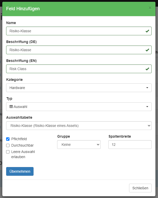 Definieren Sie danach in den Assets das Feld „Risiko-Klasse“ und verknüpfen dies mit der passenden Auswahl: