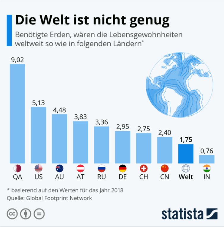 Quelle: https://de.statista.com/infografik/10574/benoetigte-erden-je-lebensstil-ausgewaehlter-laender