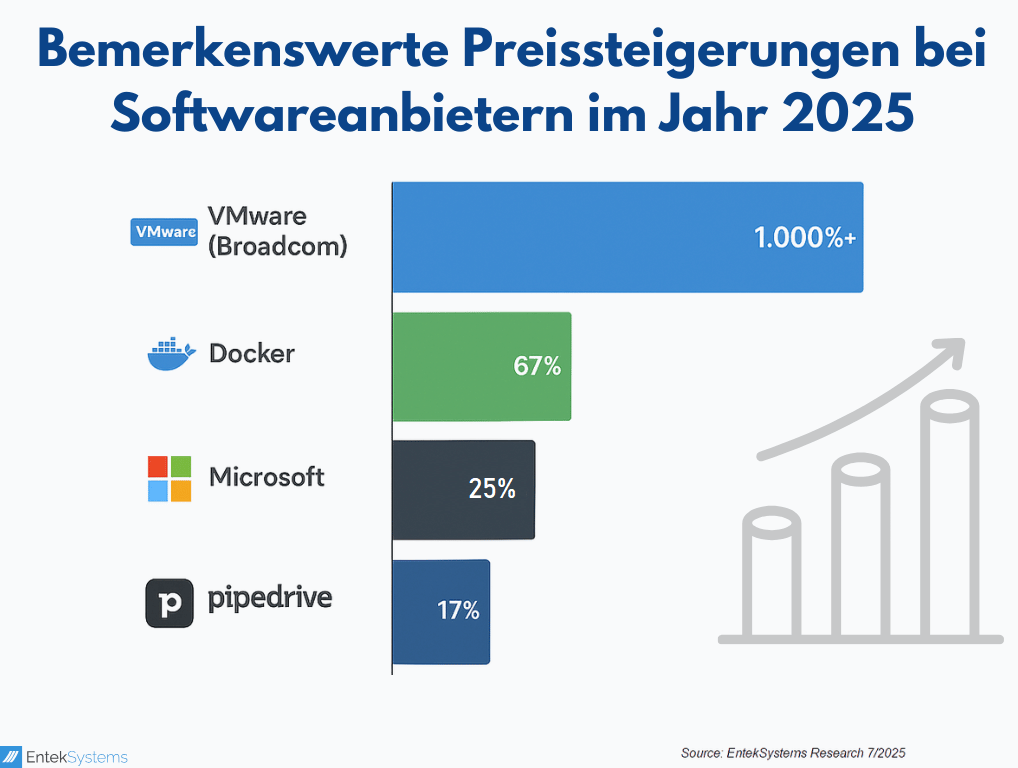 SaaS-Anbieter haben sich besonders aggressiv verhalten: Docker erhöhte die Preise für Entwicklungstools um 67–80 %, Pipedrive erhöhte die CRM-Preise um 17 % und Projektmanagement-Plattformen wie Jira erhöhten die Preise um 8 %.