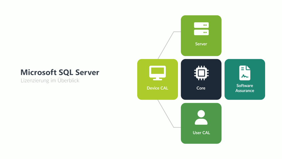 Bei der Server-Lizenzierung wird zunächst pro Server lizenziert, auf dem ein Microsoft SQL Server betrieben wird. Zusätzlich werden noch Zugriffslizenzen in Form von User CALs oder Device CALs benötigt.