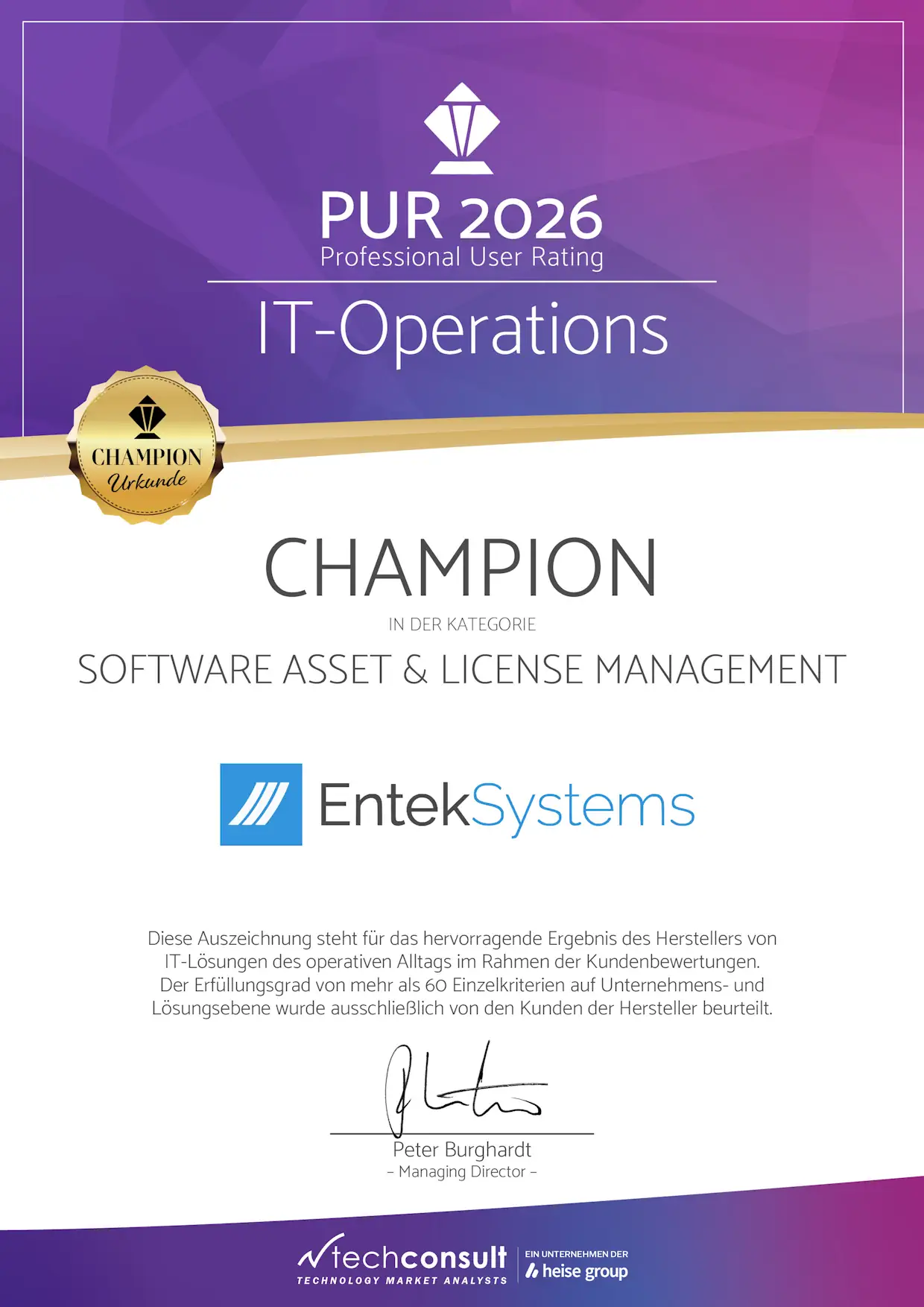 Inventory360 wurde von der techconsult, ein Unternehmen der Heise Gruppe, im Rahmen der PUR "IT Operations 2026" als Champion prämiert für die Bereiche Software Asset & License Management.