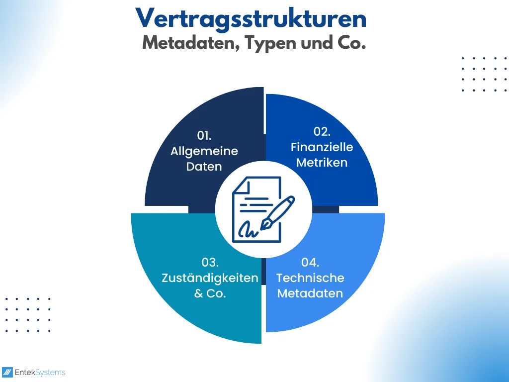 Die Metadaten untergliedern sich dabei in verschiedene Gruppen von Merkmalen, wie allgemeine Vertragsdaten, finanzielle Metriken, technische Daten und Zuständigkeiten und Co.: