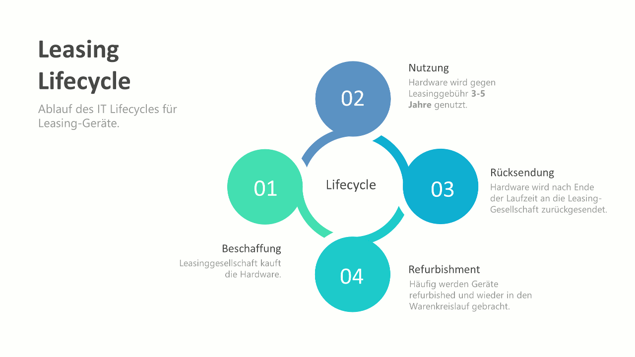 Nach Ende der Vertragslaufzeit kann die Hardware entweder an die Leasinggesellschaft zurückgeschickt oder durch die Zahlung einer Ablösesumme in das Eigentum übernommen / rausgekauft werden.