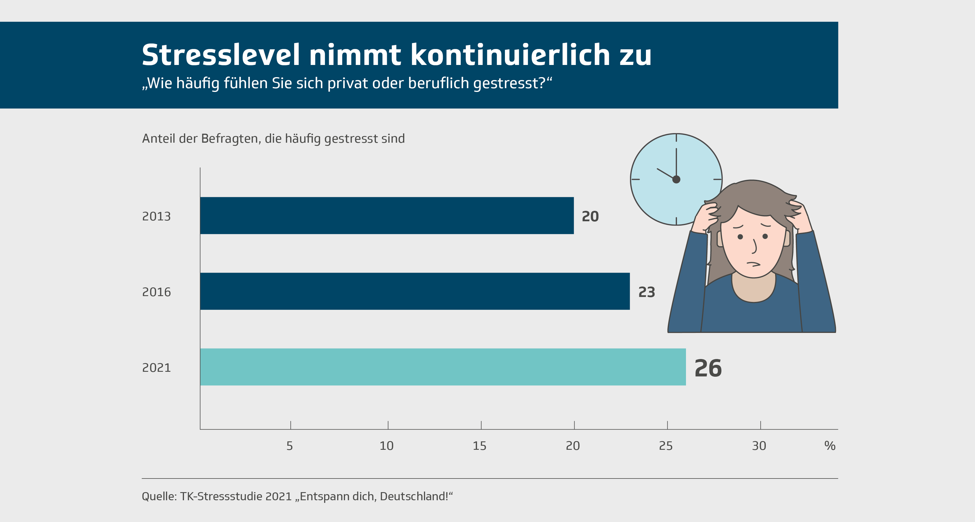 In Deutschland nimmt der Stresslevel in allen Bereichen immer weiter zu. Einer Umfrage der „Techniker Krankenkasse“ zufolge sind im Jahr 2021 26% der Befragten häufig gestresst. Stress ist somit mitten in der Gesellschaft angekommen und wird auch immer mehr zu einem unternehmerischen Wettbewerbsfaktor.