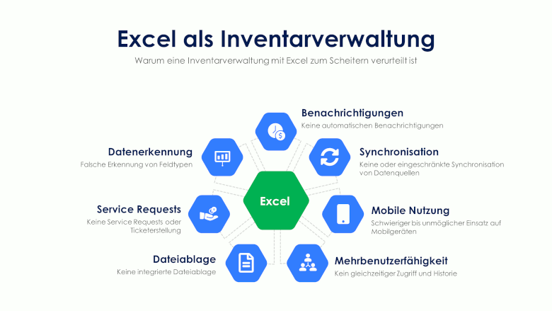 Excel hat hier einfach Schwächen, die im Vergleich zu anderen Tools durch software-unterstützte Prozesse angeboten werden können. Im Rahmen der Inventarverwaltung können alle ermittelten Daten, Änderungen und die passende Dokumentation in einem Datenpool aggregiert und für weitere Prozesse zur Verfügung gestellt werden.