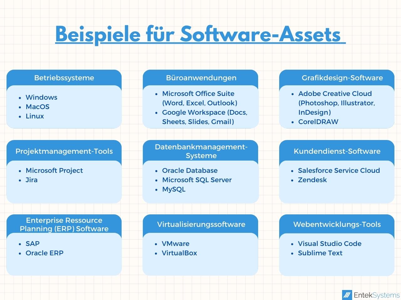 Mögliche Software-Assets sind Betriebssysteme wie Windows und MacOS, Anwendungssoftware wie Microsoft Office und Adobe Creative Cloud, Entwicklungs- und Designwerkzeuge, Datenbanksoftware, aber auch Antivirenprogramme und viele weitere Softwareanwendungen, die in Unternehmen eingesetzt werden.