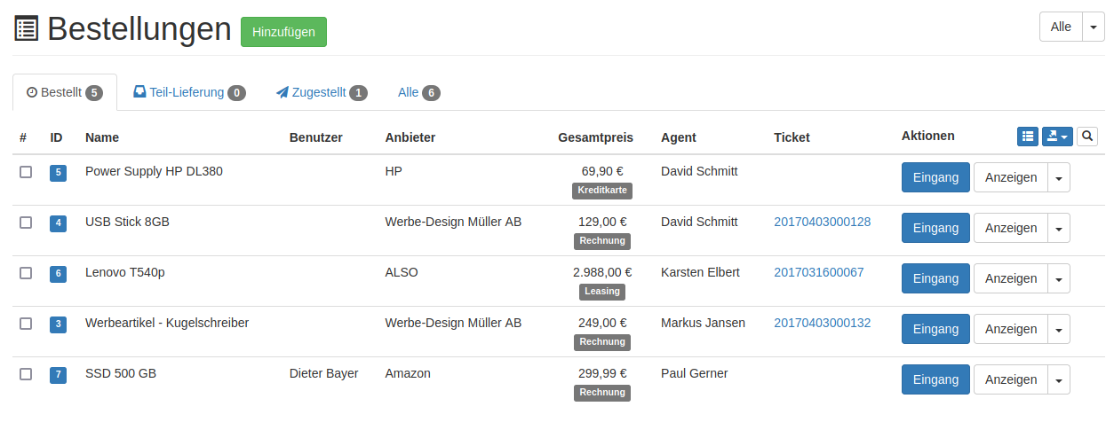 Mit einer Übersicht der getätigten Bestellungen lässt sich z.B. prüfen ob eine Bestellung bereits vollständig eingegangen ist, welcher Kollege die Bestellung ausgelöst hat und für wen diese gedacht ist. Zu guter Letzt schlagen wir mit dem Anschaffungswert und Kostenstellen wieder die Brücke zur Finanzbuchhaltung (siehe unten).