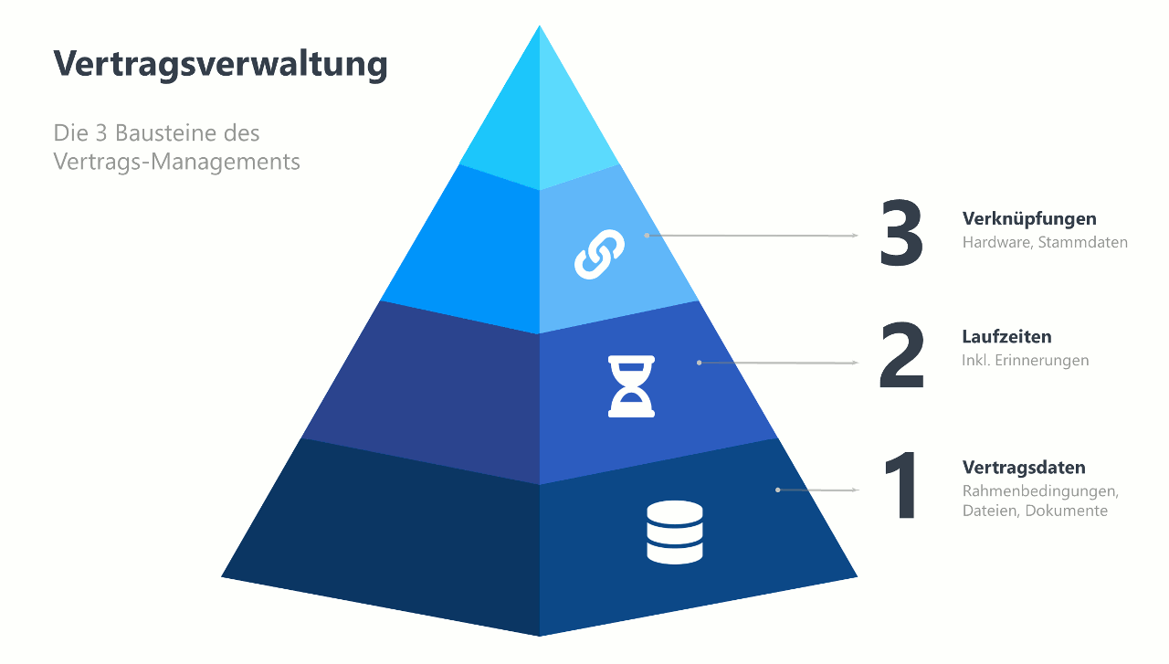 Achten Sie daher bei der Auswahl einer Vertragsverwaltung darauf, dass die notwendige Flexibilität hinsichtlich Laufzeiten und Kündigungsfristen gegeben ist.