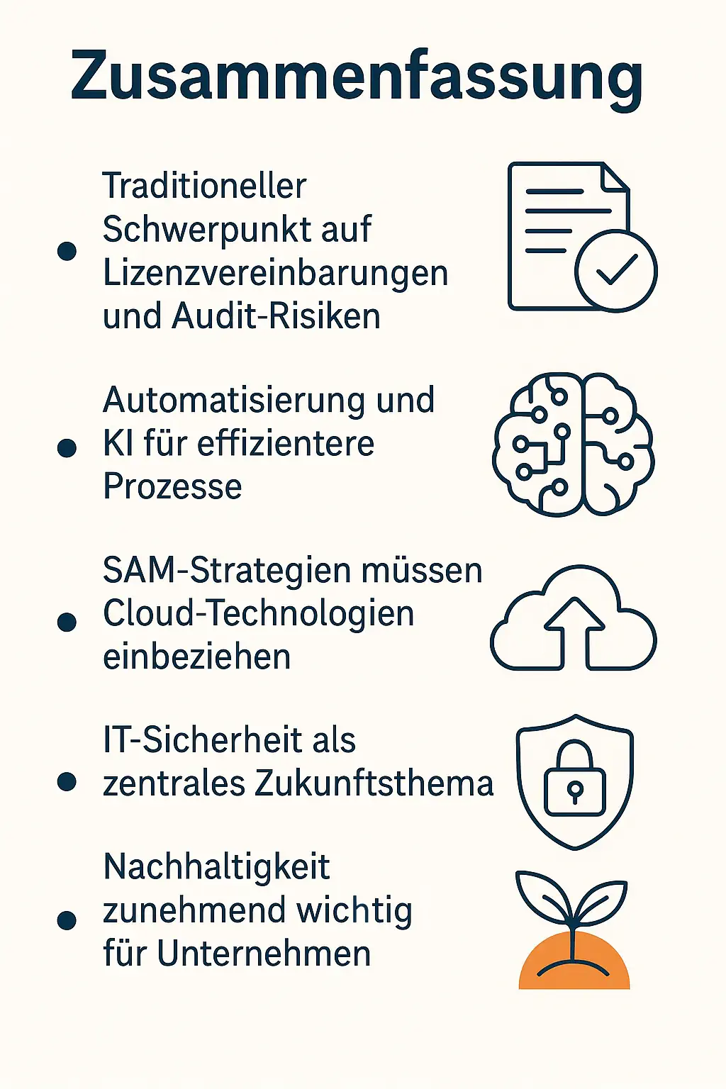 Langfristig wird SAM ein unverzichtbarer Bestandteil der digitalen Unternehmensstrategie sein. Organisationen, die sich frühzeitig auf diese Veränderungen einstellen, werden besser gerüstet sein, um sich in einer zunehmend digitalen und regulierten Welt erfolgreich zu positionieren.